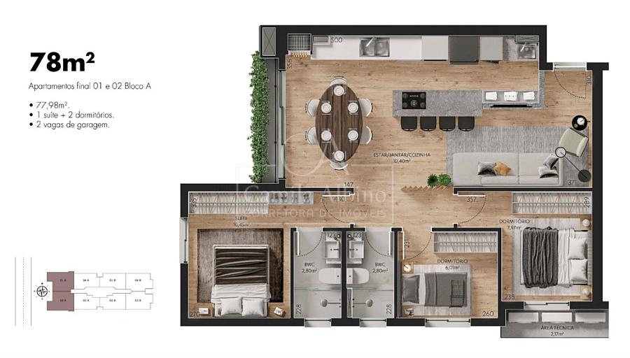 • 78m² privativos com 1 suíte + 2 dormitórios